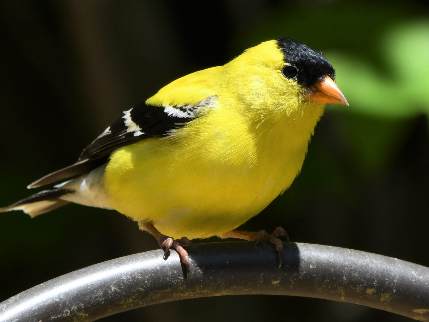 American Goldfinches are bright yellow birds with black wings and caps.