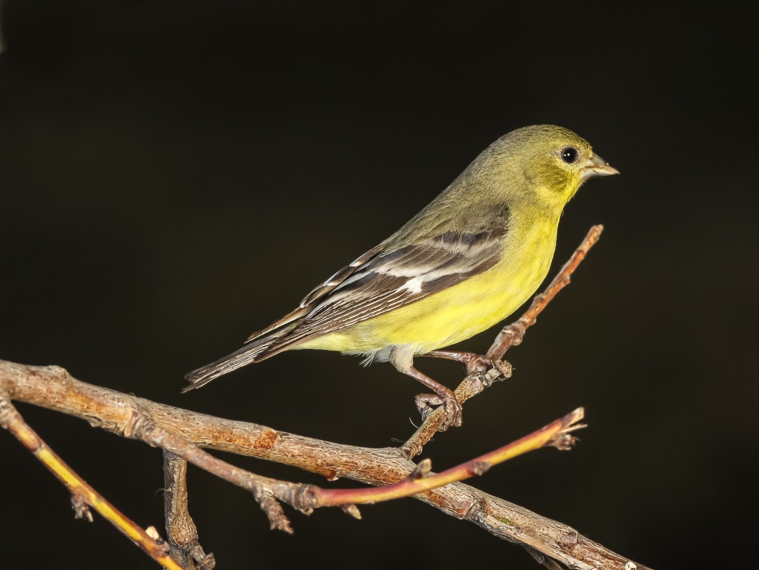 Lesser Goldfinches are small, active songbirds often found in scrubby oak, cottonwood, and willow habitats across the western U.S. They are also known to visit suburban yards for seeds and water, especially during migration periods.