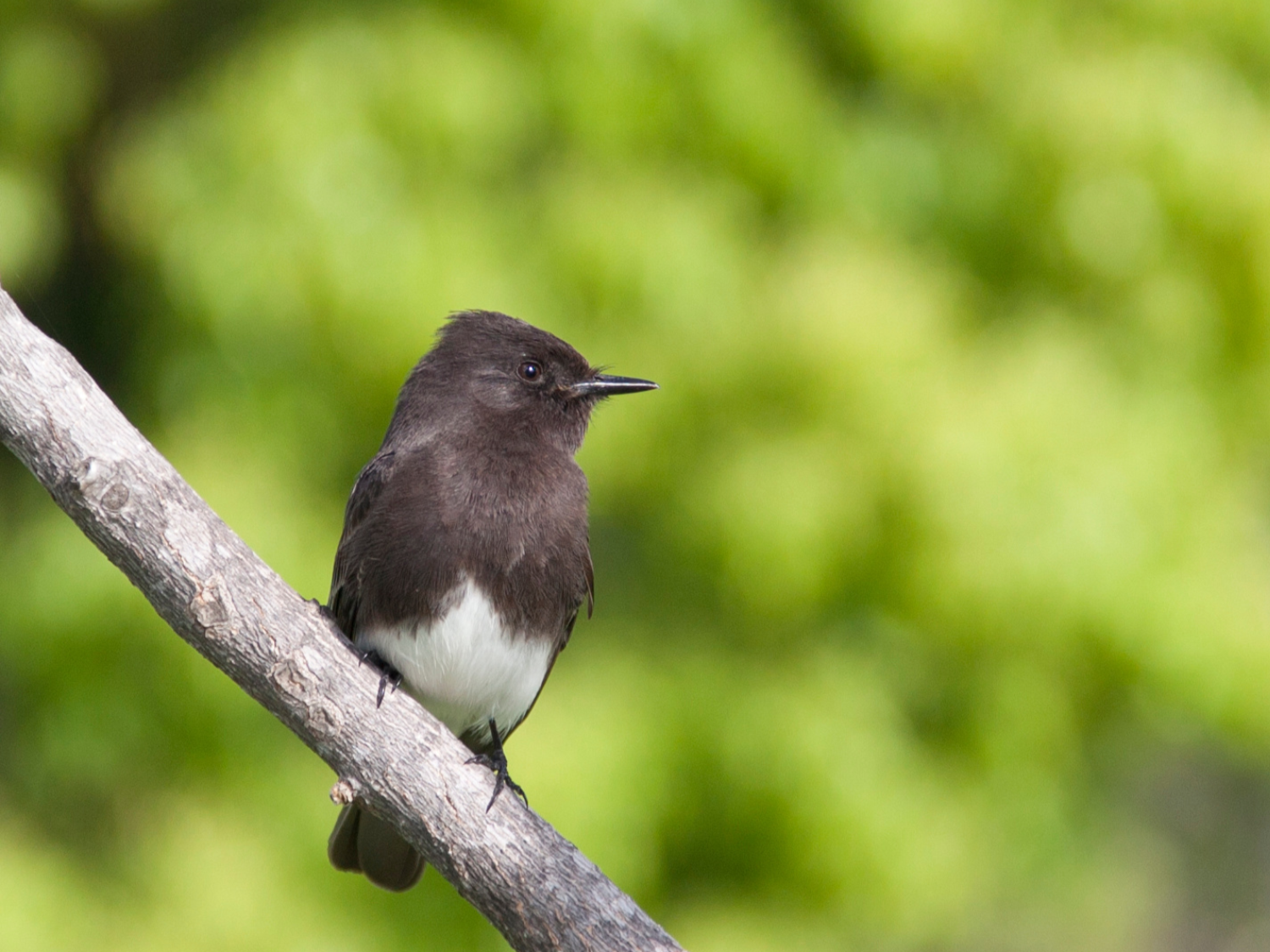 The Black Phoebe is a small flycatcher with distinctive black plumage and a white belly.