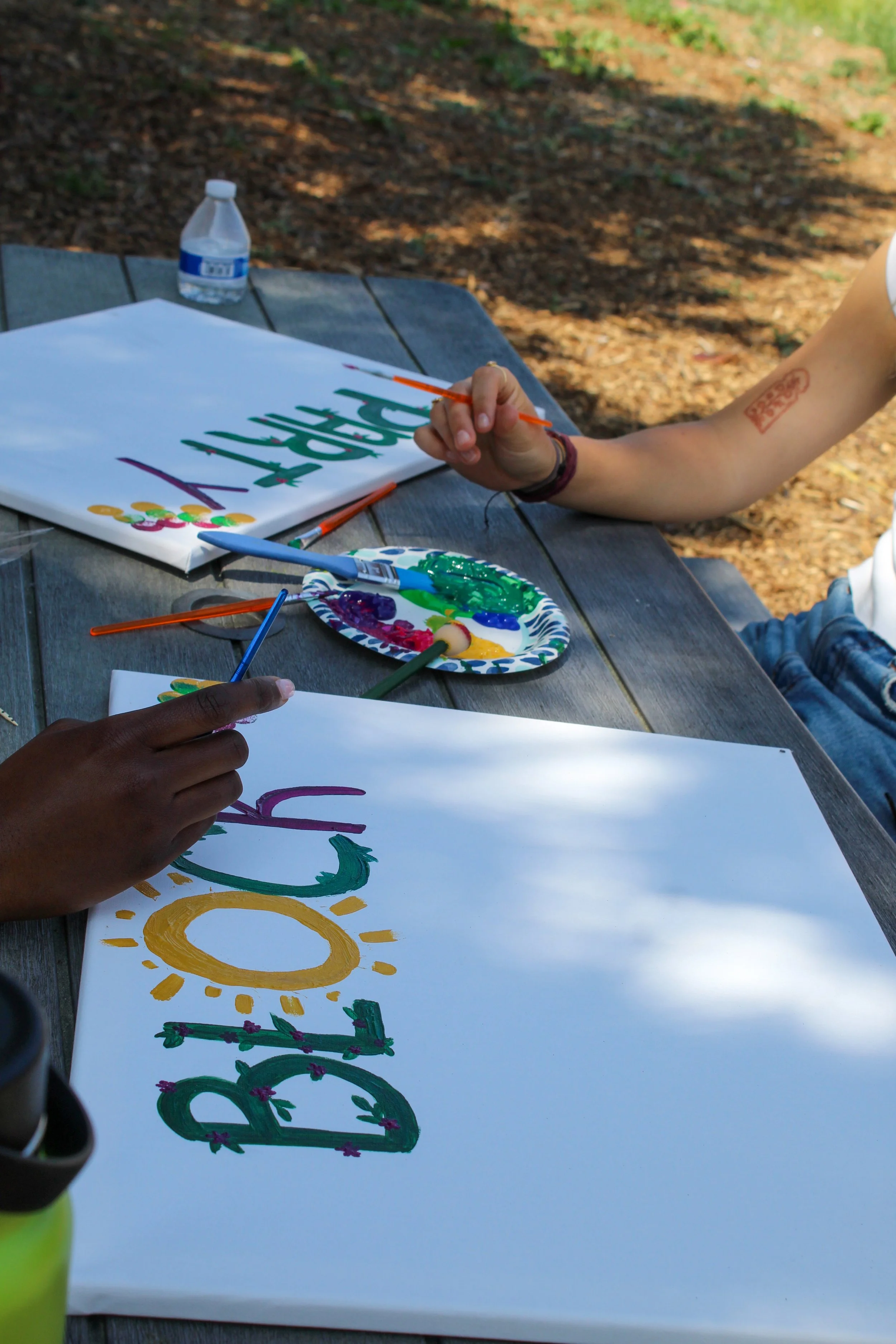 One of the main concepts The Block Party was highlighting to all guests was Sustainability. Many students from both the Academy and the University class brought glass jars, pots, and encouraged all guests to bring old glass jars to paint and design beautiful and fun pots for their plants! After painting them they had the opportunity to grab some plants from our garden. Over at the Succulent Garden and right next to our new mini Library, guests had a fun time designing their own bookmarks! Not only were they using adorable stamps, stickers, and colorful markers, guests were able to use leaves and old fruits as stamps! What better way to promote the connection of literacy and the soothing feeling of nature!